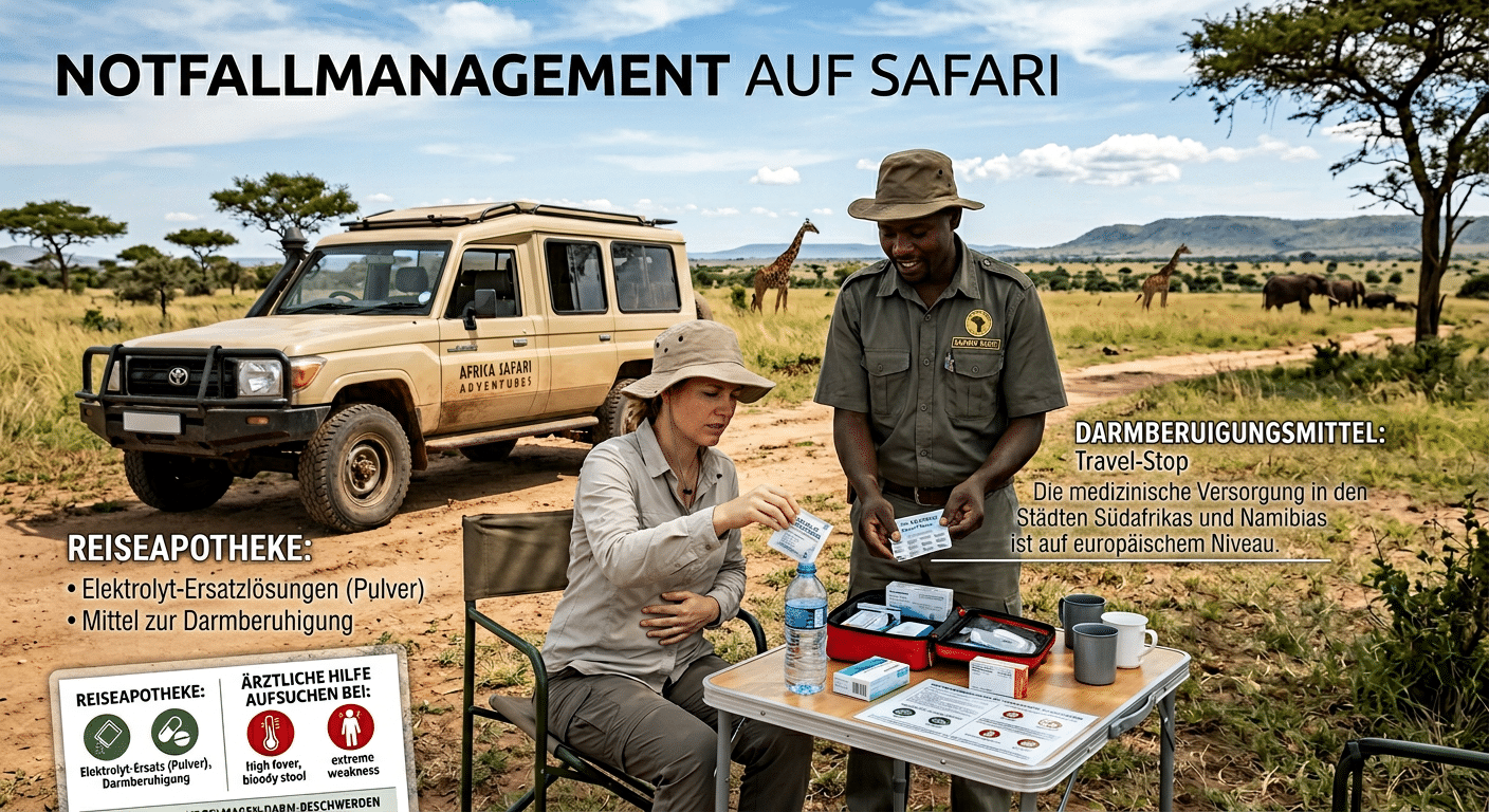 Ärztliche Hilfe: Suchen Sie einen Arzt auf, wenn hohes Fieber, blutiger Stuhl oder eine extreme Schwäche auftreten. Die medizinische Versorgung in den Städten Südafrikas und Namibias ist auf europäischem Niveau.