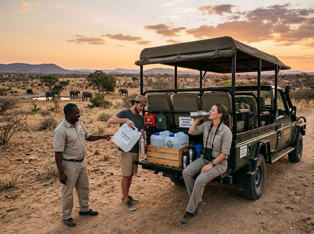 Safari-Destinationen: In Nationalparks wie dem Krüger-Park oder dem Etosha-Nationalpark wird Wasser oft über weite Strecken transportiert oder lokal gefiltert.