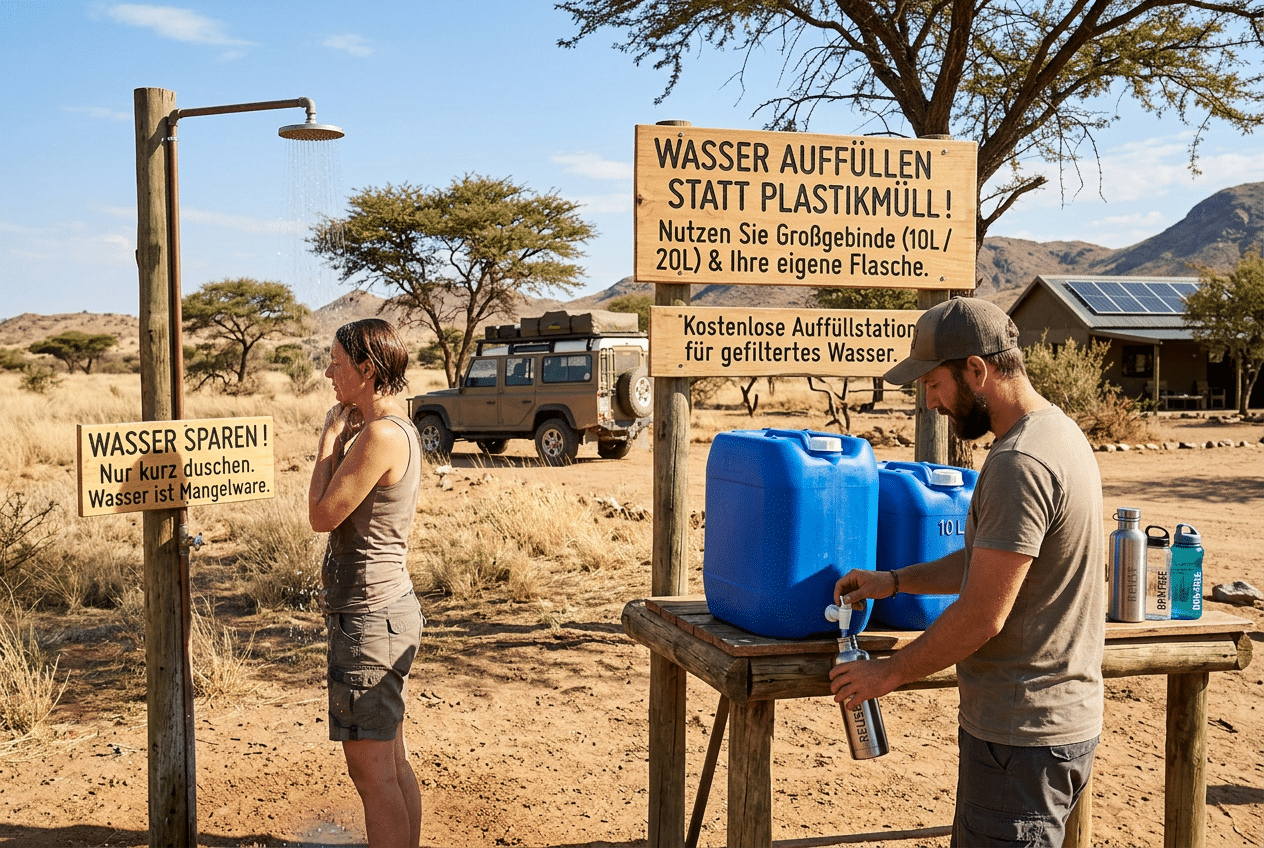 Um den Plastikmüll zu reduzieren, sollten Sie auf den Kauf unzähliger 0,5-Liter-Flaschen verzichten. Kaufen Sie stattdessen große 10- oder 20-Liter-Gebinde und füllen Sie Ihre stabilen Trinkflaschen (aus Edelstahl oder BPA-freiem Kunststoff) regelmäßig auf. Viele moderne Lodges bieten mittlerweile kostenlose Auffüllstationen für gefiltertes Wasser an.