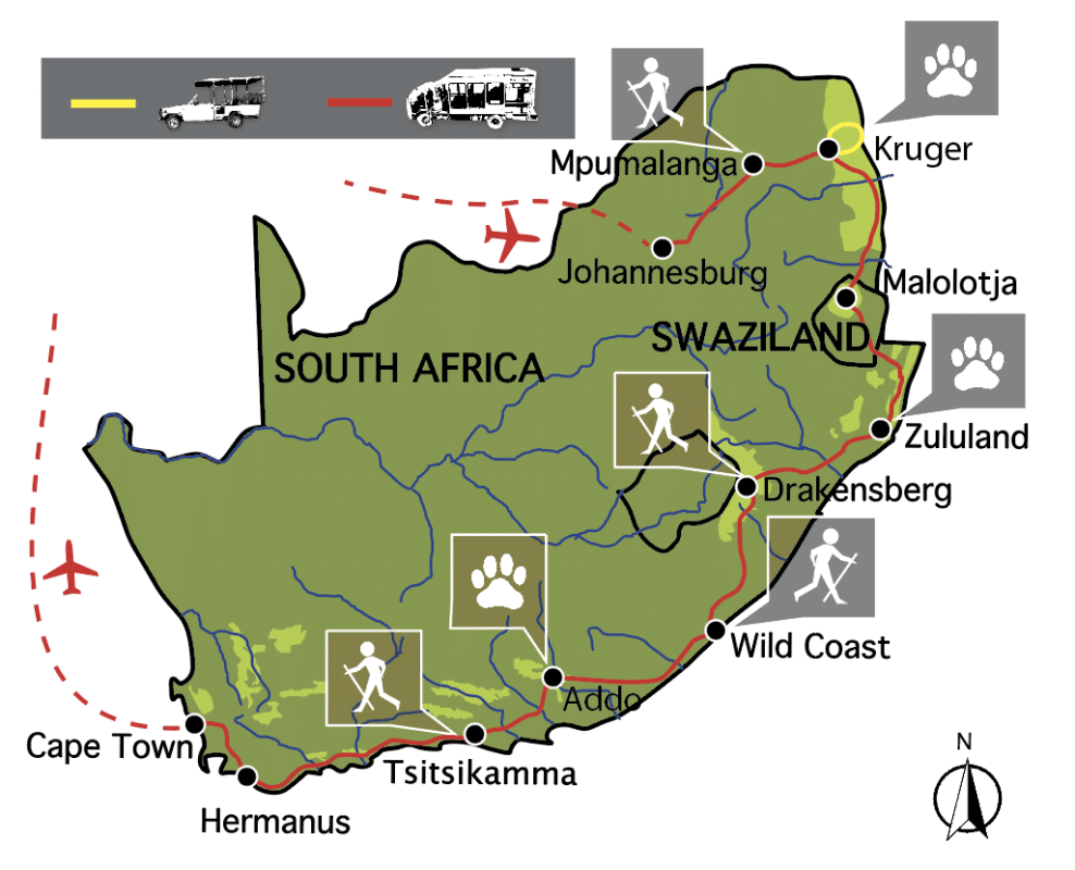 • Jeder, der über einen guten gesundheitlichen Allgemeinzustand verfügt, wird die Südafrika Erlebnisreise problemlos genießen können. Einfaches Campen in der Wildnis ist für Naturburschen und –frauen eine wahre Freude. Man wird schon mal ein wenig staubig und schwitzt, aber gerade das macht Afrika aus!